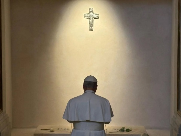 Két pápa – az egyik a földön térdelve, a másik az égből letekintve – találkozott ebben az egyszerű, teljesen fehér térben. Erős kép.
