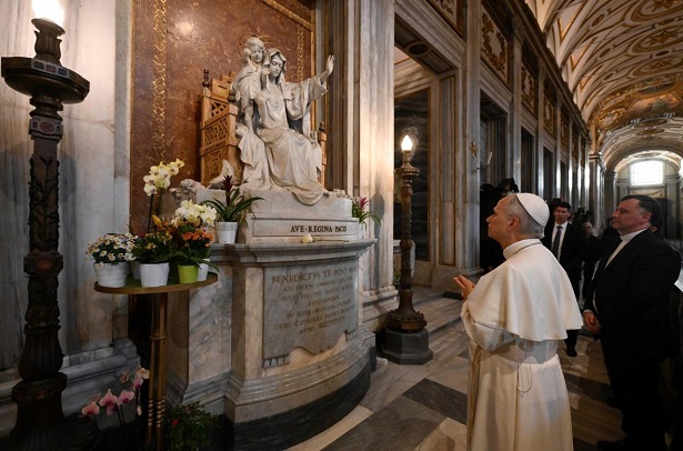 A hívek a főhajó két oldalán az oszlopsoroknál elhelyezkedve várták a pápát, aki mosolyogva, jobb kezét felemelve üdvözölt mindenkit. Az okostelefonok és kamerák hada minden lépést megörökített, néhányan megsimították, kezet fogtak a pápával, aki a Salus Populi Romani-kegykép felé indult. Néhány pillanatra megállt imádkozni Róma védőszentjének ikonja előtt, amelyet a történelem és a hagyomány szerint Szent Lukács festett, és egy csokor rózsát helyezett az oltárra.