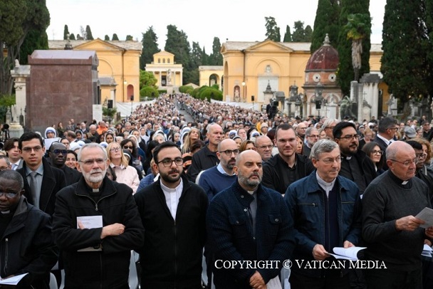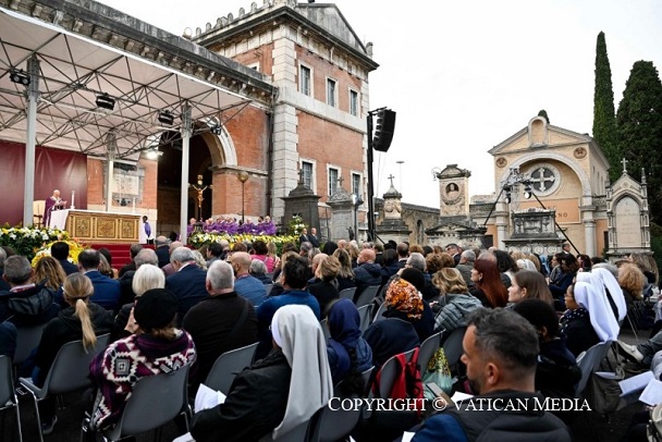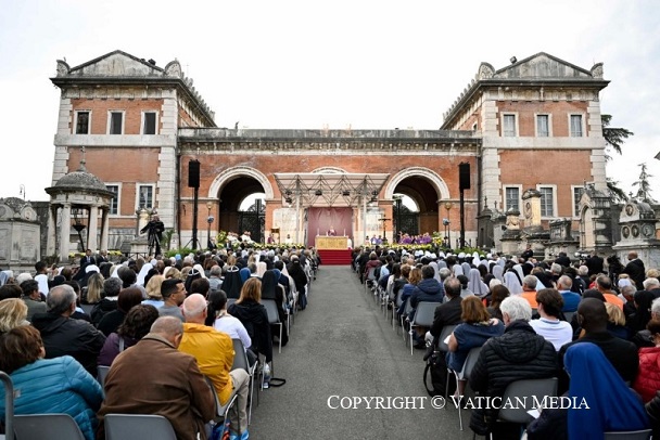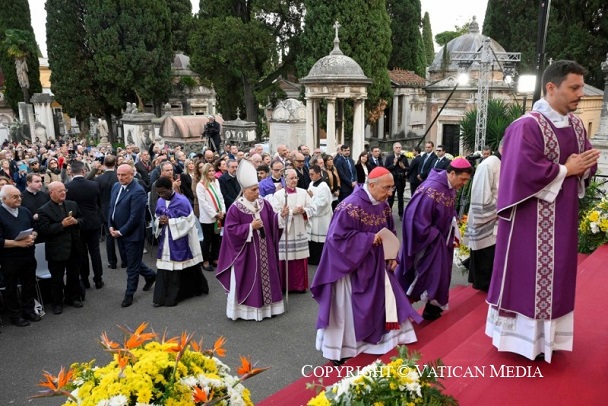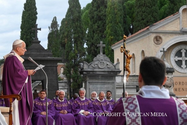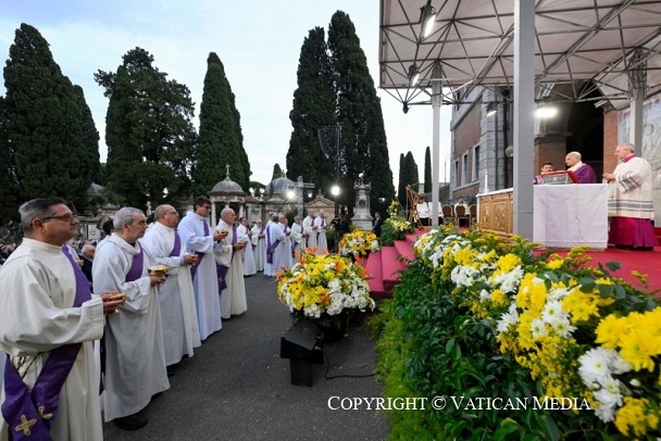 A Szentatya Baldo Reina bíboros, római vikáriusa kíséretében érkezett meg a temetőbe, ahol első gesztusaként a bejáratnál lévő első sírra helyezte el virágcsokrát, majd néhány percig imába mélyült és áldását adta a temetőben nyugvó összes elhunytra. Homíliájában a Szentatya arra buzdított, hogy az Úr örök életre szóló ígérete nyújtson támaszt nekünk, törölje le a könnyeinket, irányítsa tekintetünket arra a jövőbeli reményre, amely soha el nem múlik.