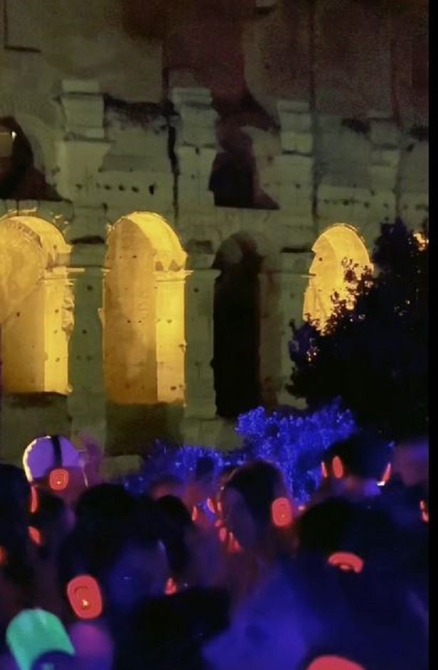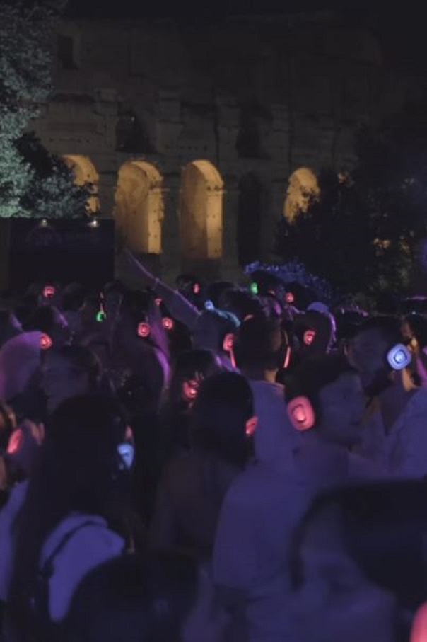 Az olasz csendes diszkó vezető eseménye az Örök Városban landolt. Az előadás egyedülálló: a tömeg táncol és énekel, tisztelettel a hely szentsége előtt, mögötte pedig a flaviusi amfiteátrum világít.