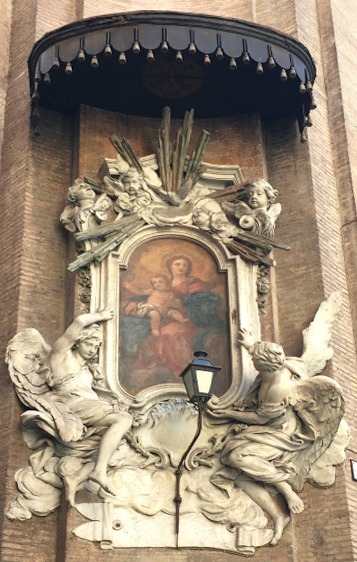 Nell’angolo adiacente all’ingresso di Casa delle Letterature sul maestoso Palazzo dei Padri Filippini, tra Via del Governo Vecchio e Piazza dell’Orologio, è possibile ammirare un’edicola sacra, una bellissima immagine affrescata della Madonna che trattiene sulle ginocchia un vivace Bambino. Quest’opera barocca rappresenta uno dei più eleganti tabernacoli del tardo seicento, la cornice di questa edicola grandiosa è da attribuire allo scultore Tommaso Righi mentre l’affresco al pittore Antonio Bicchierai.